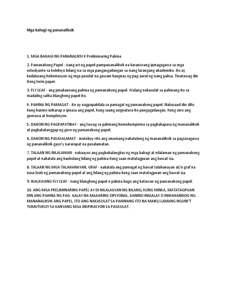 Mga Bahagi ng Pamanahong Papel Pt 1 1. View PAGBUO NG PANANALIKSIKpdf from ENGLISH GE03 at Rizal Technological University. Kabanata I - Ang Suliranin at Kaligiran Nito.