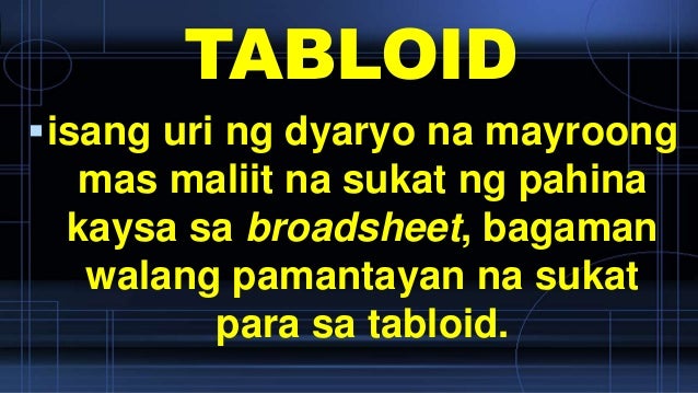 Ang terminong tabloid journalism o periyodismong tabloid kasama ang paggamit ng malalaking imahe ay nagbibigay-diin sa mga paksa tulad ng mga kahindik-hindik na kwento ng mga krimen astrolohiya tsismis at telebisyon. Learn vocabulary terms and more with flashcards games and other study tools. Editoryal o opinyon showbiz libangan at sports.