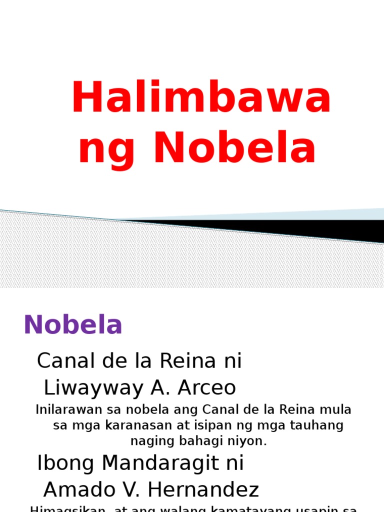HALIMBAWA NG NOBELA Sa paksang ito tatalakayin natin kung ano nga ba ang tinatawag na nobela. Nobela - o kathambuhay ay isang mahabang kuwentong piksyon na binubuo ng ibat ibang kabanata. LAYUNIN NG NOBELA.