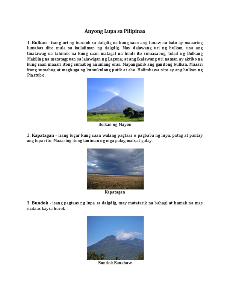 Ang bundok ay isang uri ng lupa na pataas mula sa daigdig. Kapatagan isang lugar kung saan walang pagtaas o pagbaba ng lupa patag at pantay ang lupa rito. May dalawang uri ng bulkan una ang tinatawag na tahimik na kung saan matagal na hindi ito sumasabog tulad ng Bulkang Makiling na matatagpuan sa lalawigan ng Laguna.