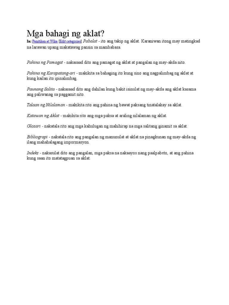 Mga maliliit na kaisipang magbibigay ng karagdagang impormasyon sa paksang sinasaliksik na nakasulat nang sunud-sunod at paalpabeto. Ang layunin ng may akda sa pagsulat ng aklat. Ang aklat ay may ibat - ibang bahagi at ang bawat bahagi nito ay may ginagampanang katangian na bumubuo sa isang libro.