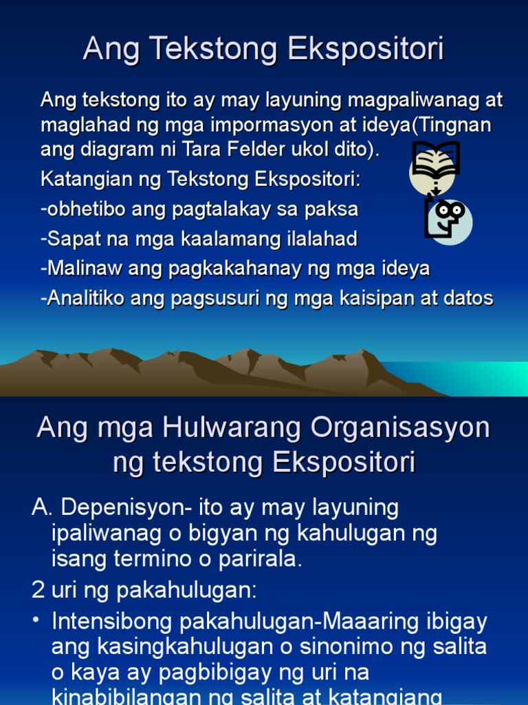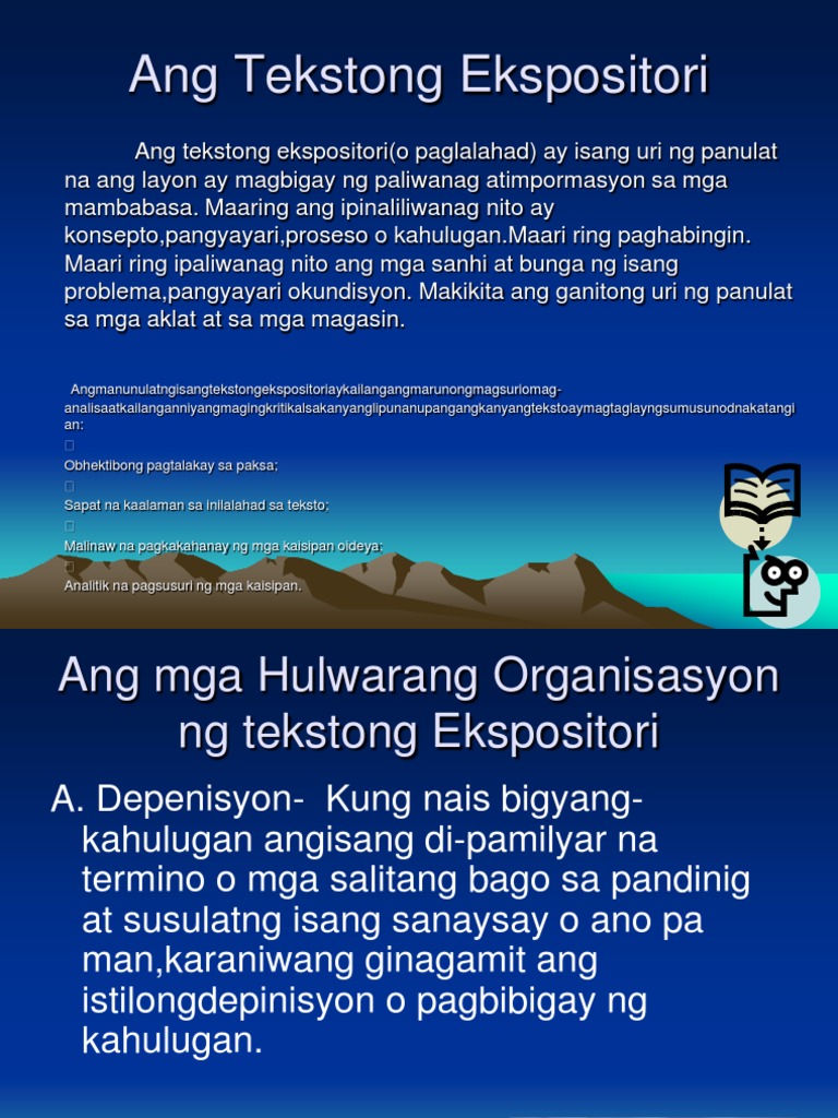 Mga uri ng ekspositori. Paglilinaw o Ekspositori Isang uri ng sulatin o komposisyon na naglilinaw nagpapaliwanag nagbibigay ng impormasyon na gumagamit sa alinman sa mga sumusunod na paraan. Nakikilala ang tekstong nasa anyong Ekspositori 2. Kung iisipin natin ang sitwasyon sa klasrum mahirap para sa guro at estudyante na gumamit ng banyagang wika sa paglalahad ng karanasan at mga konkretong halimbawa kaugnay ng mga paksang tinatalakay sa Siyensa at mas lalo na.