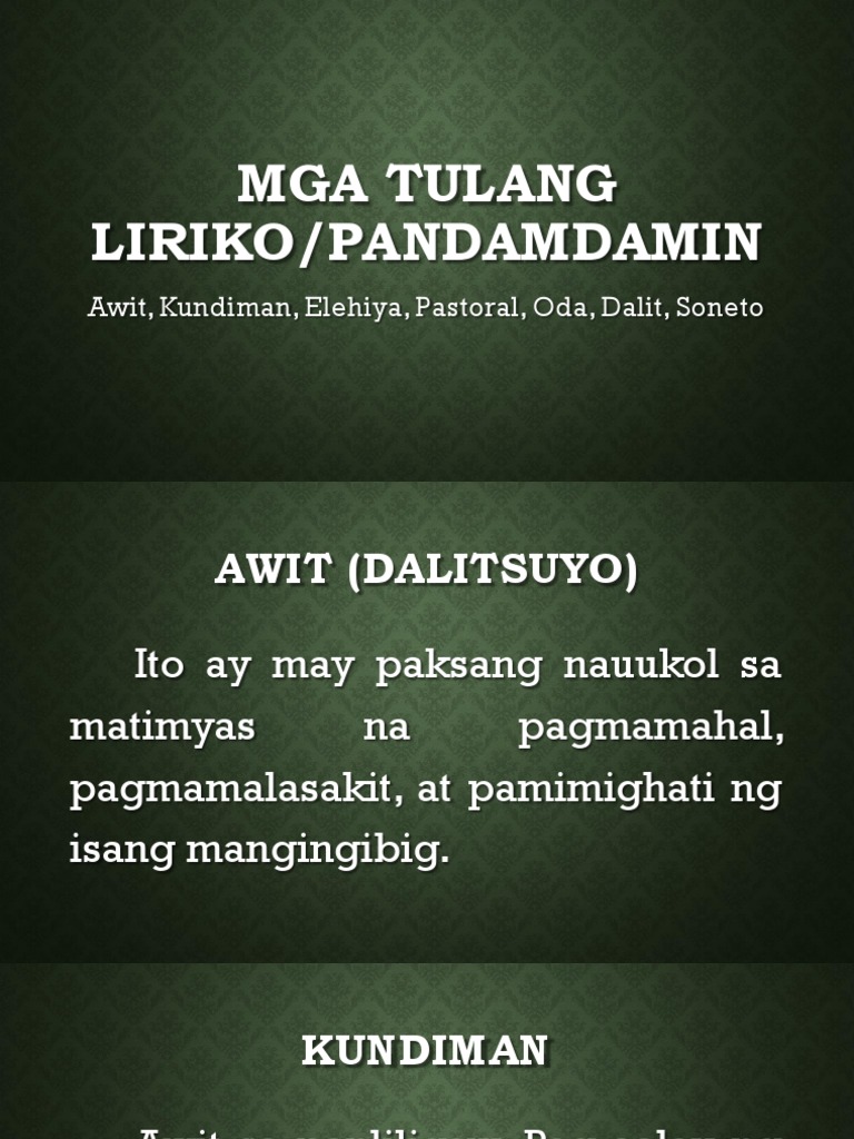 ANG TULA AY NAHAHATI SA APAT NA PANGUNAHING URI. Higit na personal sa pagpapahayag ng damdamin kaysa sa ibang estilo ng panulaan. MGA DAPAT TANDAAN SA PAKSANG ITO.