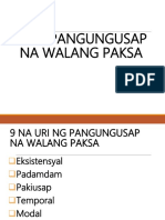 - nagsasaad ng pagtataglay o pagka mayroon ng isa o mahigit pang. 9 NA URI NG PANGUNGUSAP NA WALANG PAKSA Eksistensyal Padamdam Pakiusap Temporal Modal Mga Ka-pandiwa Penomenal Mga Panawag Pambating Panlipunan 3. Nagpapahayag ito ng damdamin ng paghanga.